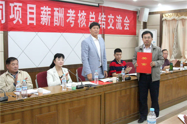 集团公司2014年8月份项目部薪酬考核总结暨节点成本兑现会议,于9月18日上午9时召开。会议由杨莹副董事长主持。寇学武副总经理对集团公司8月份项目部薪酬考核情况进行汇报;商卫执行总经理宣读了8月份薪酬考核表彰决定;对8月份薪酬考核取得第一名的第六工程分公司中海•天悦府项目部进行表彰,颁发奖金1万元和流动红旗一面。