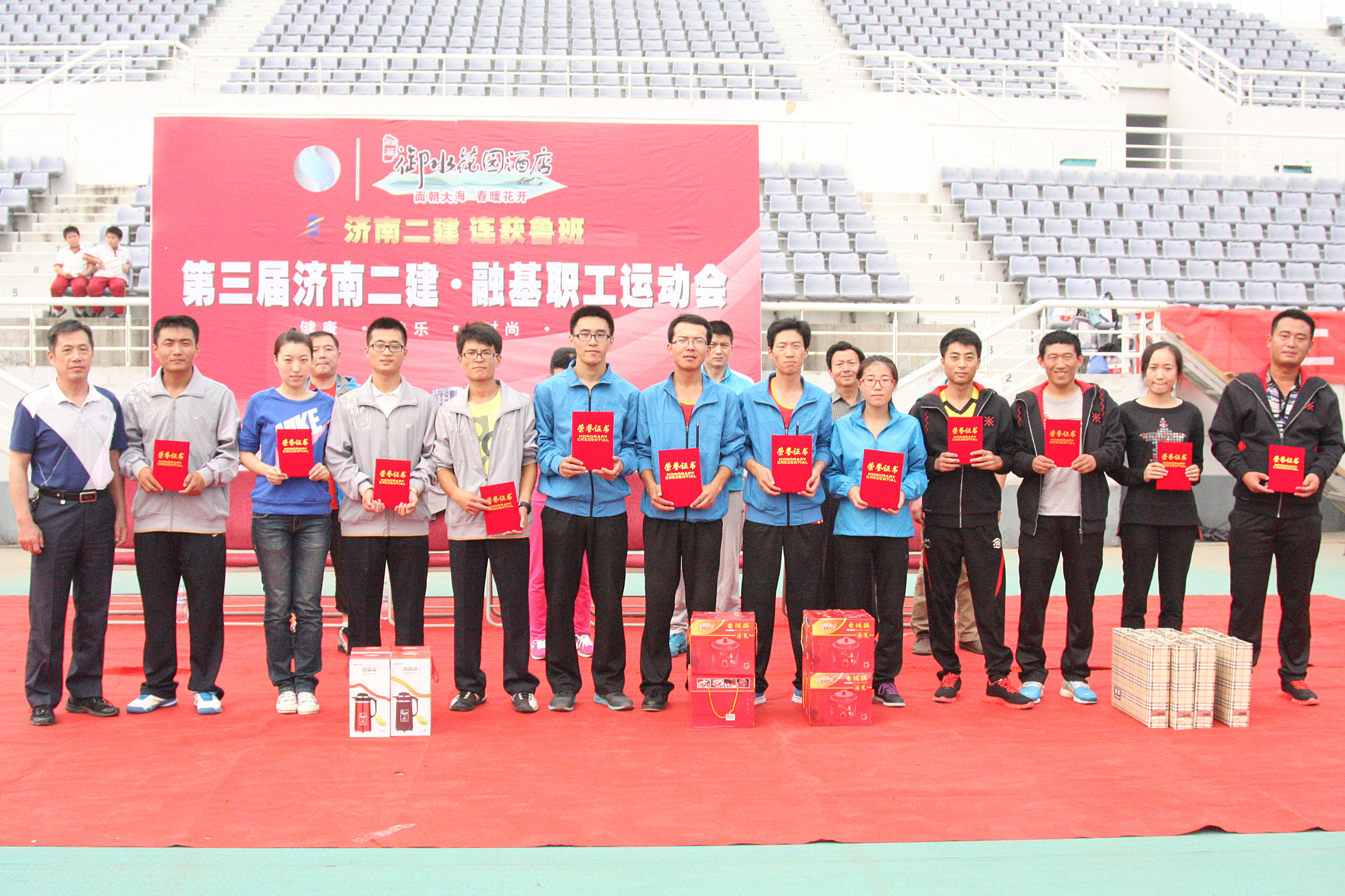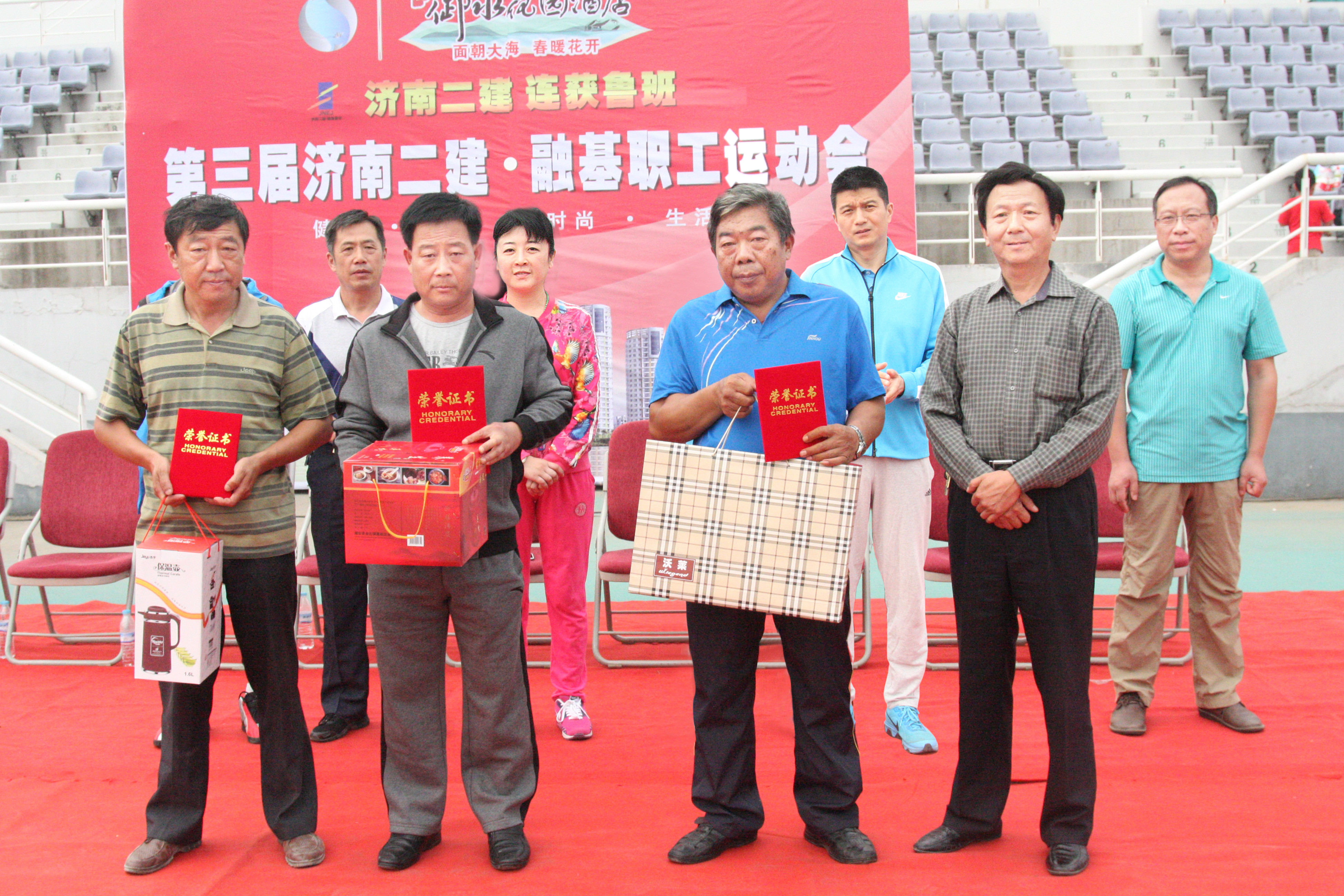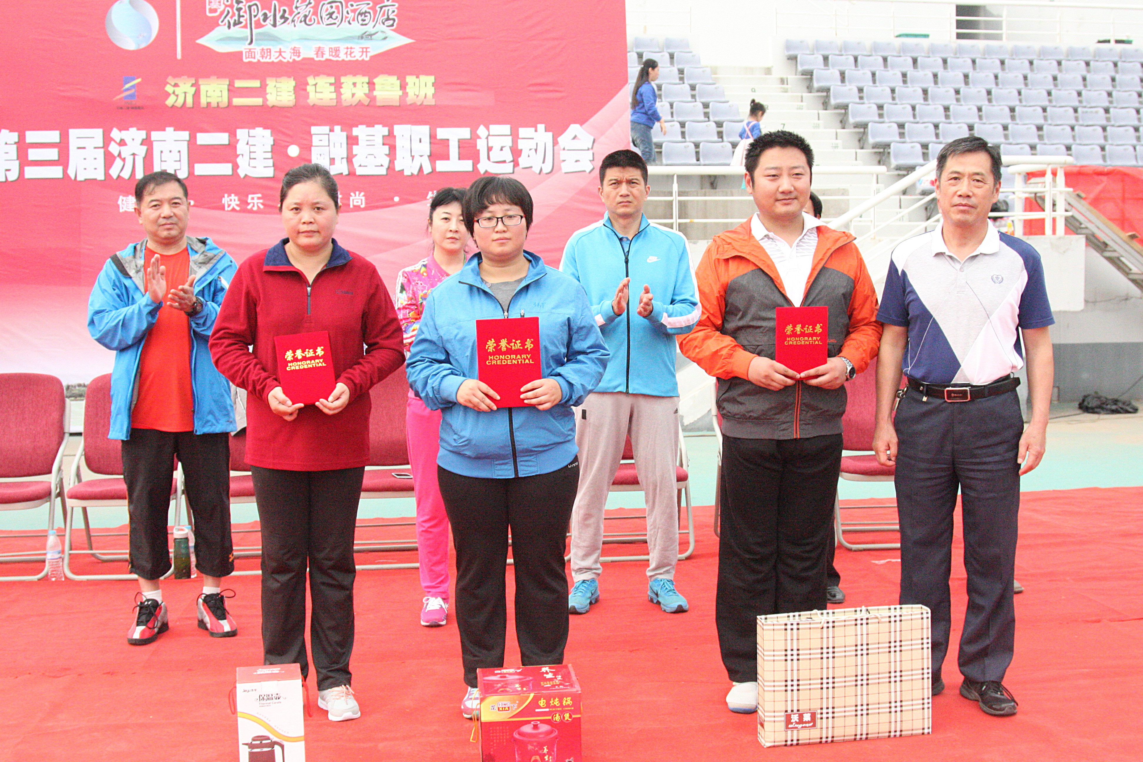 6曹怀武副总经理为获得4 X 100米比赛第一名的六分公司代表队、第二名的集团公司机关代表队、第三名的十分公司代表队颁发证书和奖品