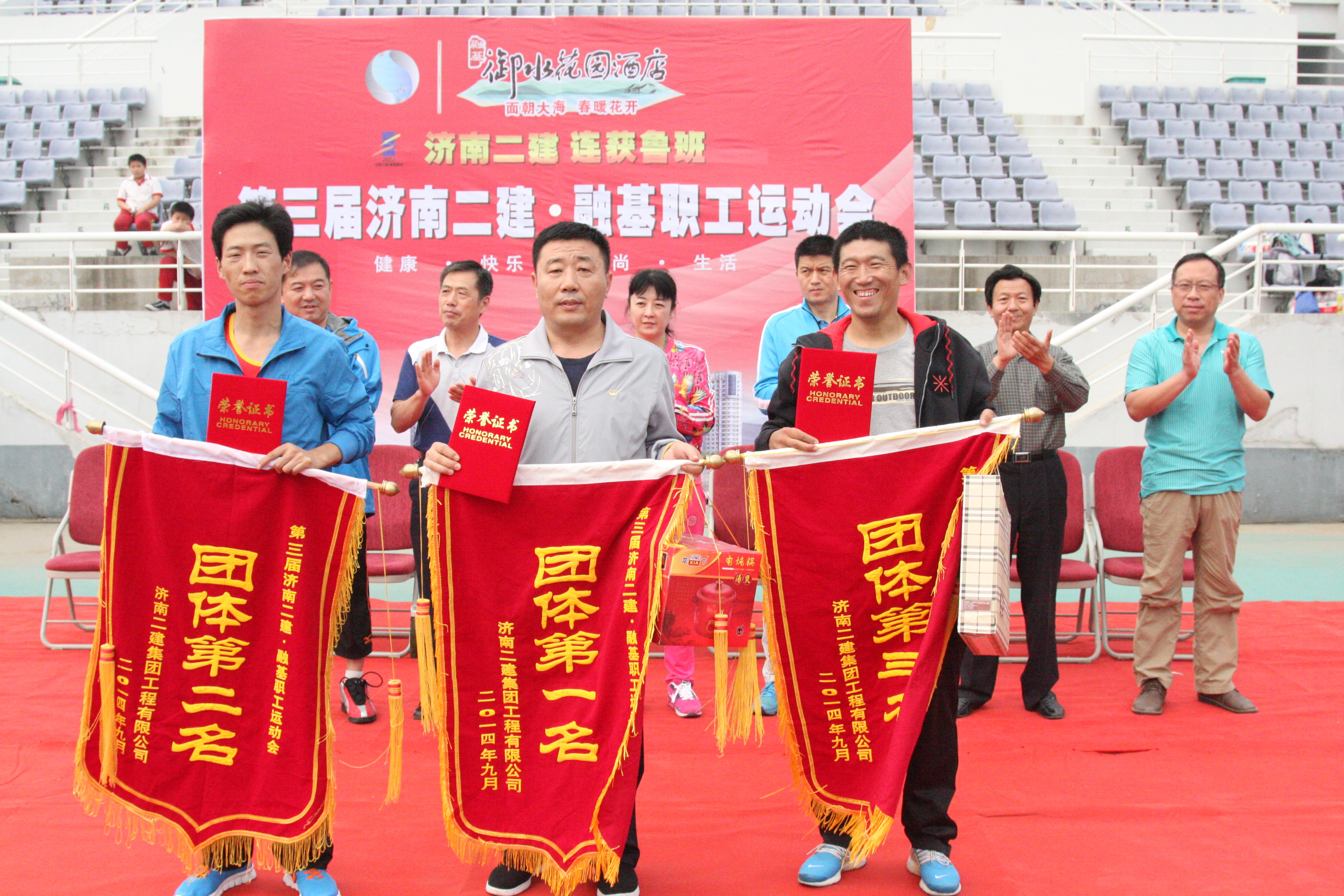 1杨莹副董事长为获得团体第一名的集团公司机关代表队、第二名的六分公司代表队、第三名的十分公司代表队颁发锦旗和证书