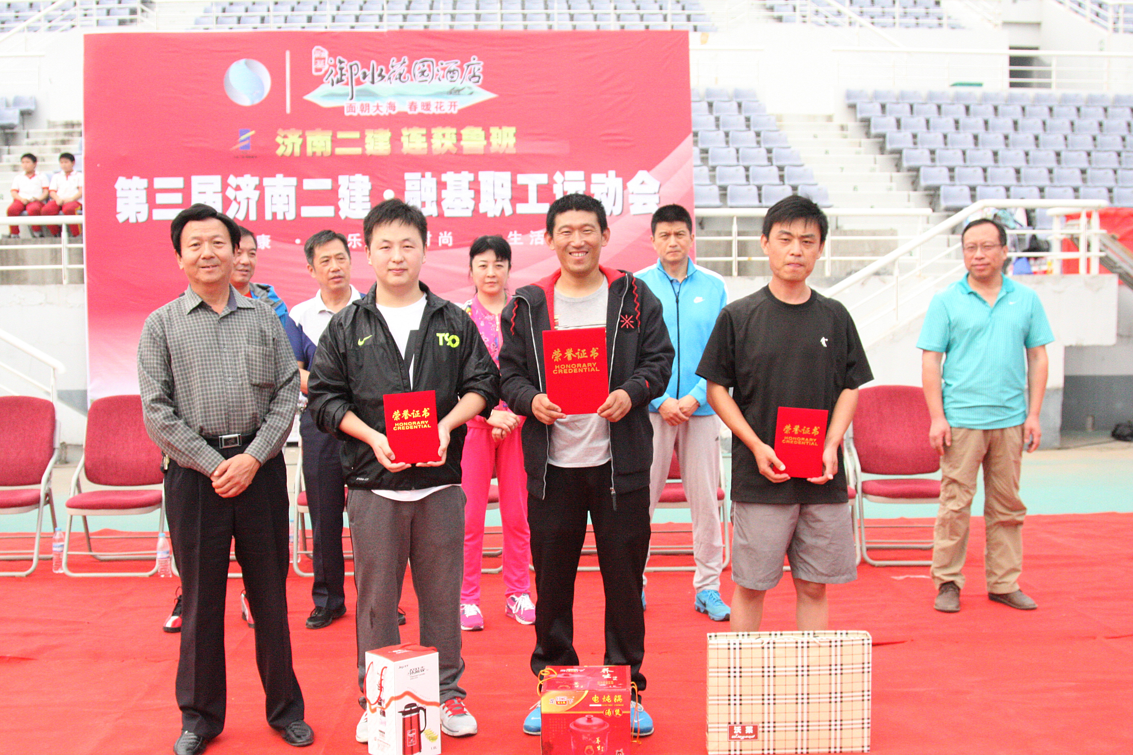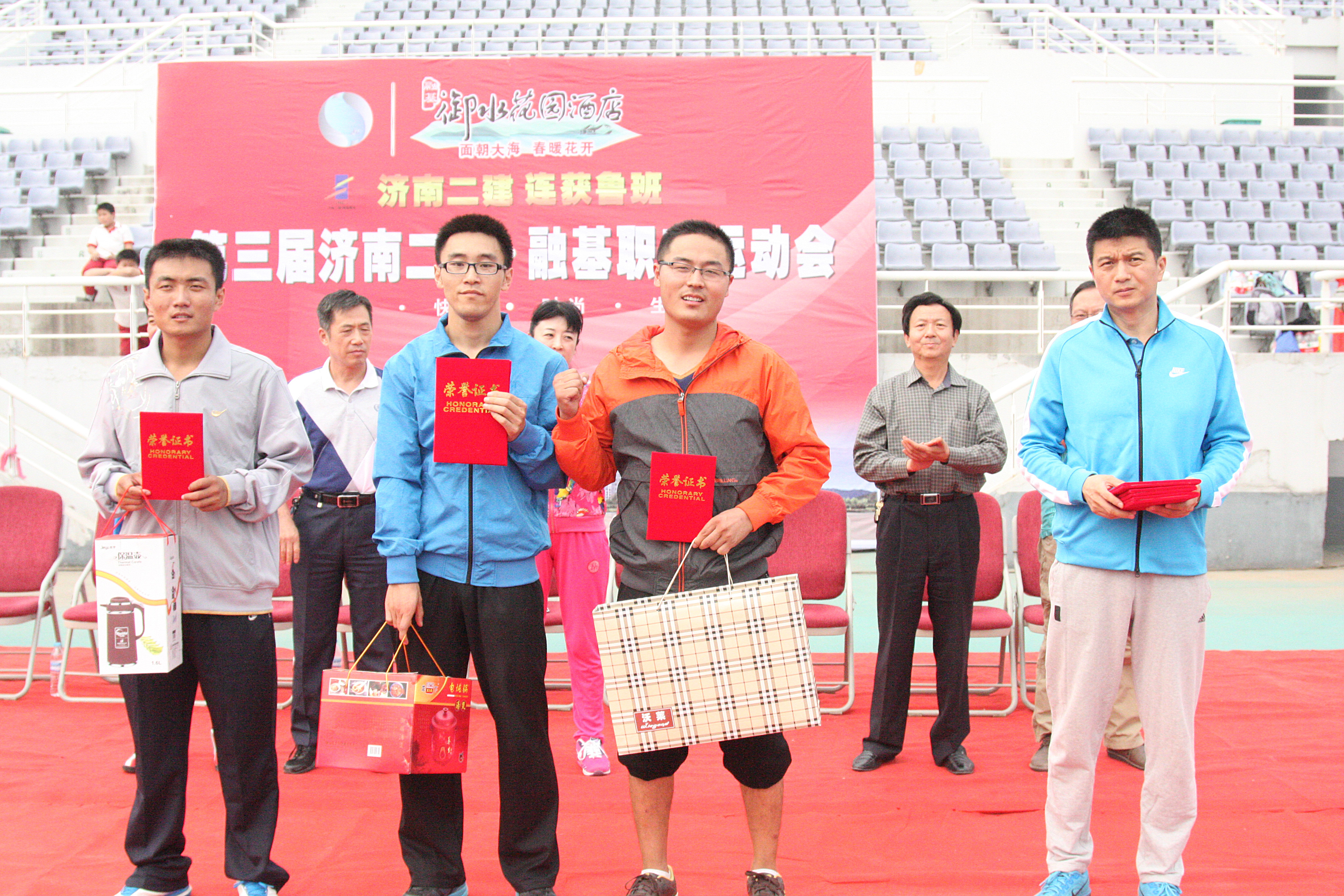 3商卫执行总经理为获得男子组100米比赛第一名的六分公司代表队高纪彬、第二名的集团公司机关代表队孙良臣、第三名的八分公司代表队殷亮颁发证书和奖品
