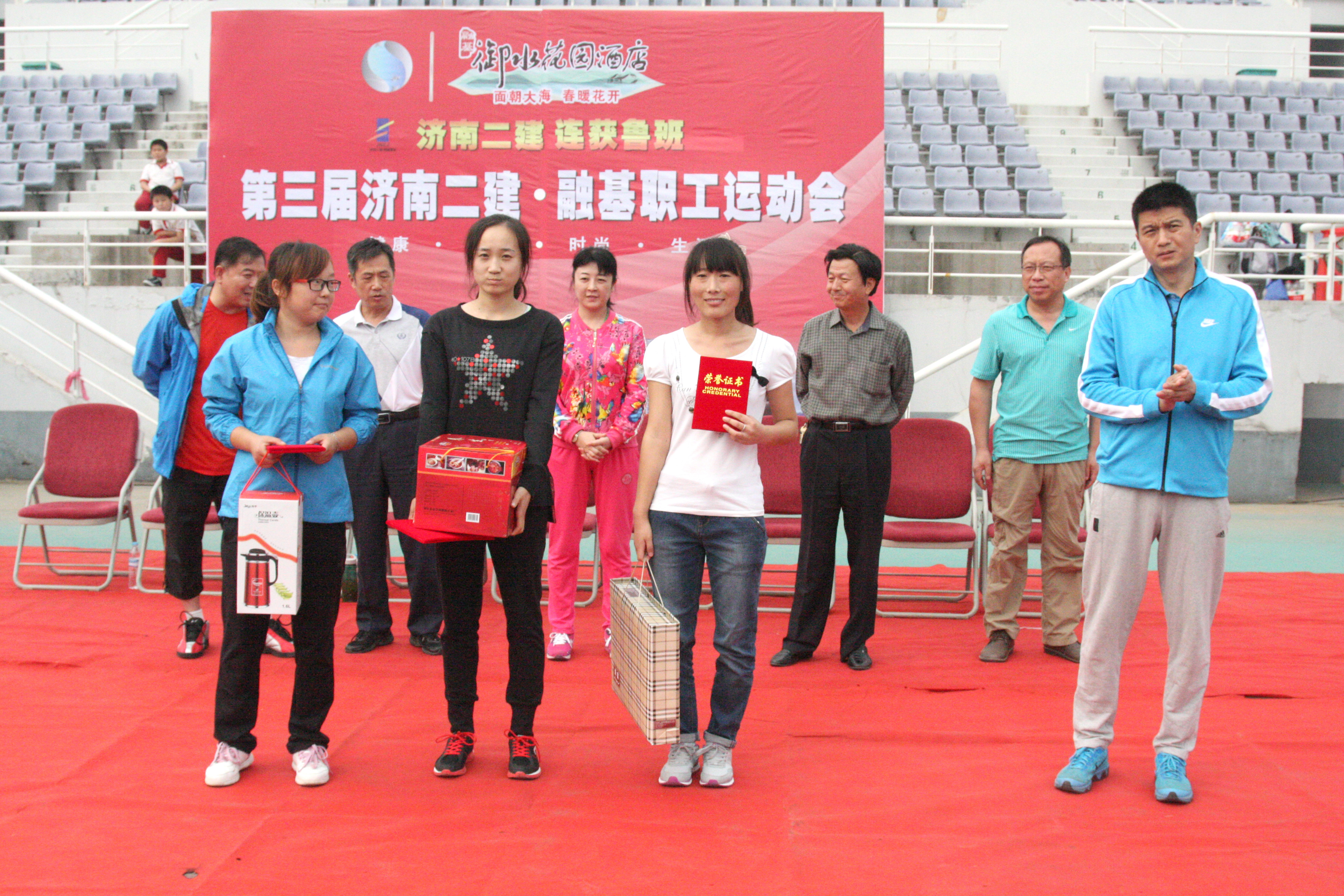 12宋立新副总经理为获得女子组跳远比赛第一名的十分公司代表队王珍、第二名的六分公司代表队张萌、第三名的五分公司代表队宋丽丽颁发证书和奖品