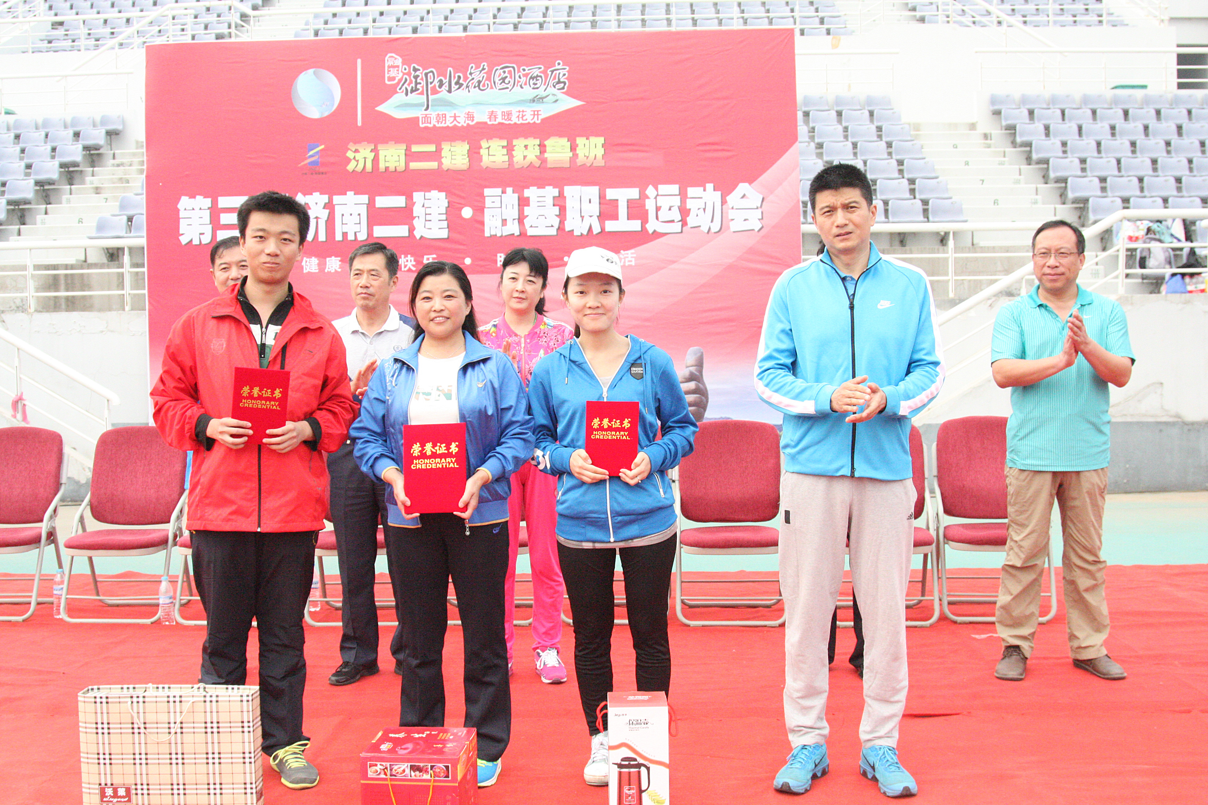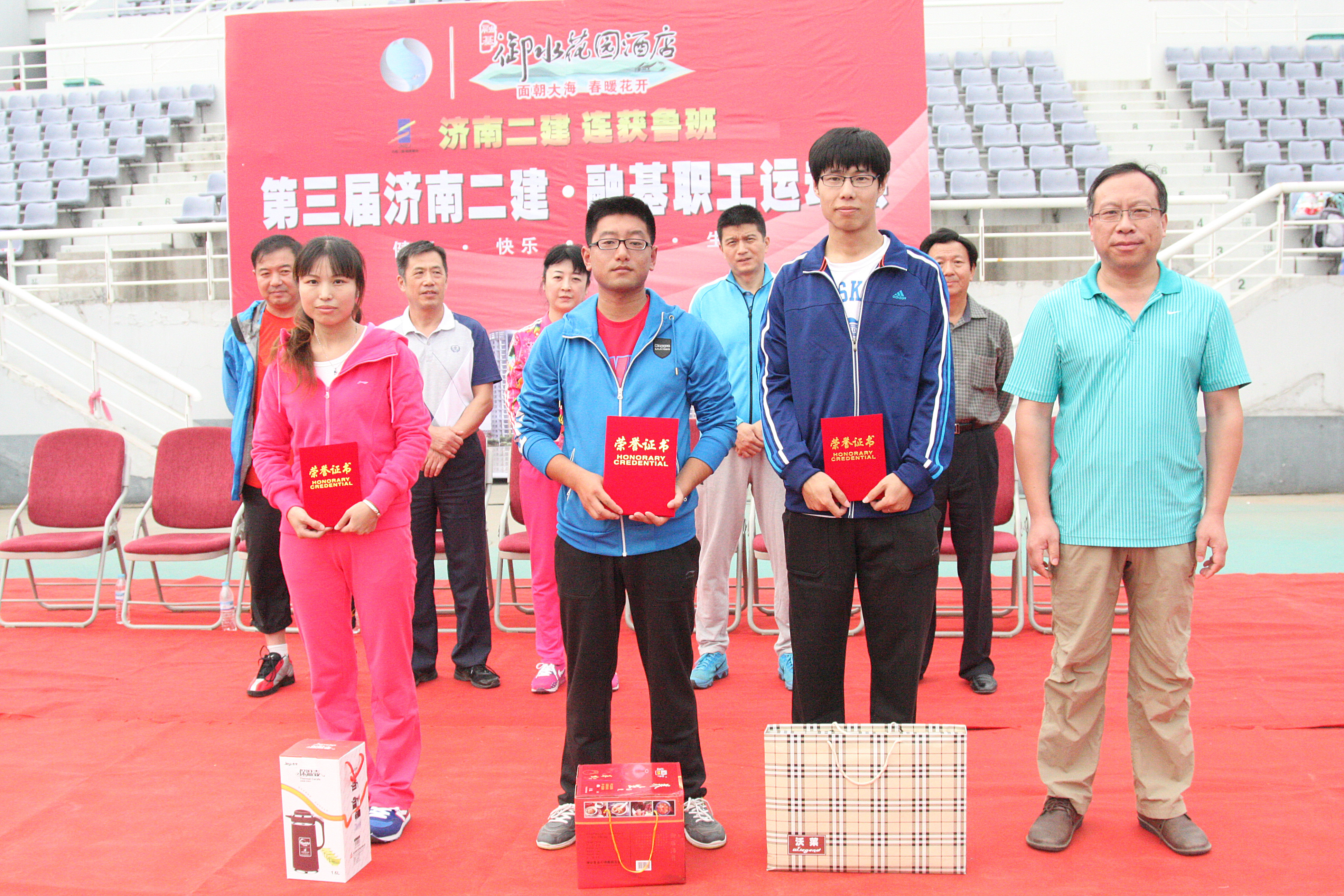5商卫执行总经理为获得趣味项目跳绳比赛第一名的集团公司代表队王思华、第二名的七分公司代表队李易宁、第三名的直属项目联队代表队王诚鑫颁发证书和奖品