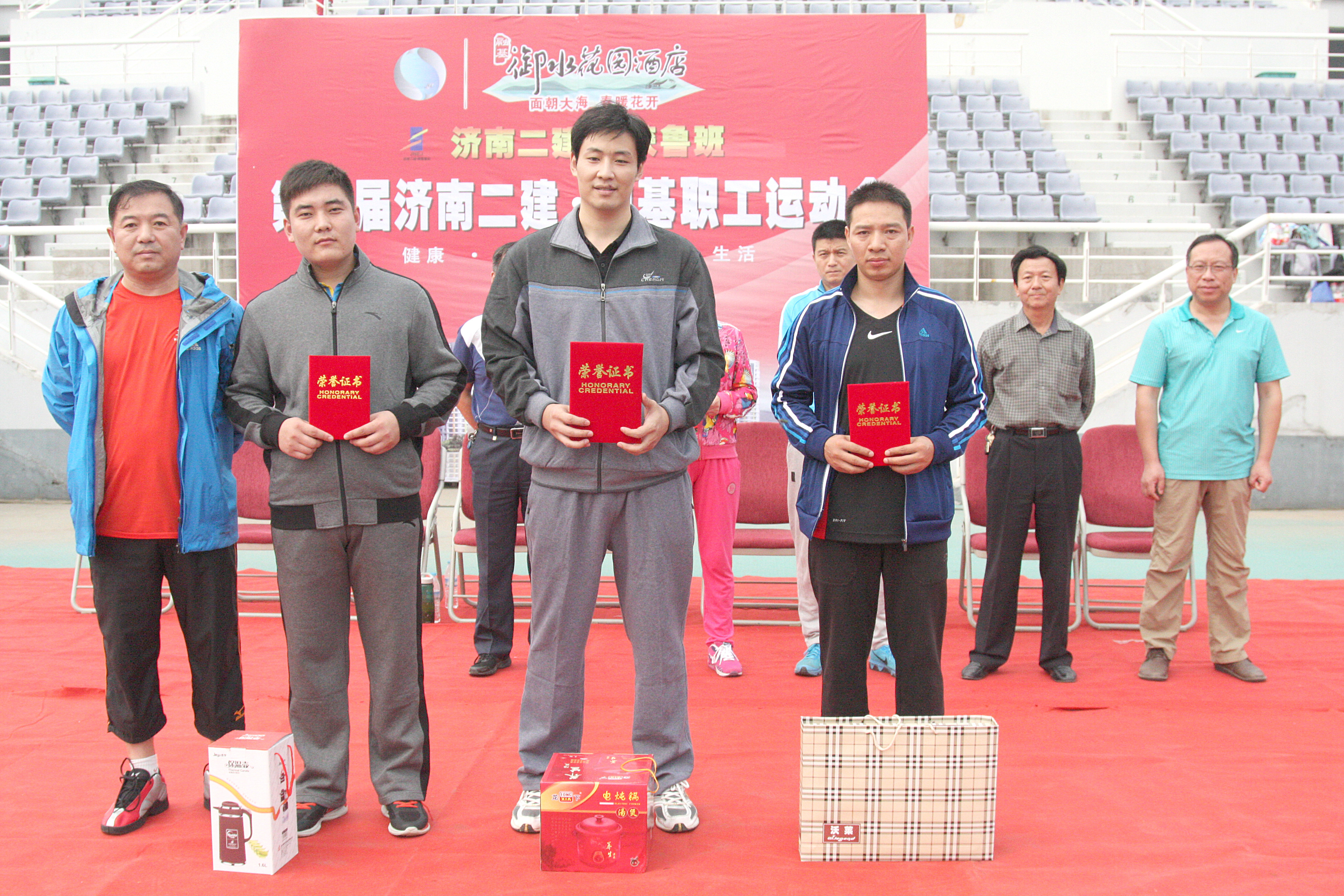 8张立升副总经理为获得男子组800米比赛第一名的十分公司代表队李志刚、第二名的专业、五有限公司联队代表队李传旺、第三名的东营分公司代表队马栋栋颁发证书和奖品