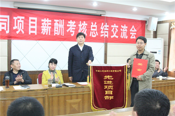 集团公司10月份项目部薪酬考核总结暨节点成本兑现会议,于11月6日上午9时在集团公司南三楼会议室召开。会议由杨莹副董事长主持。王同河副总经理汇报了集团公司10月份项目部薪酬考核情况并宣读了10月份薪酬考核表彰决定,对10月份薪酬考核取得第一名的第一工程分公司中海华山片区C地块项目部进行表彰,颁发奖金1万元和流动红旗一面。