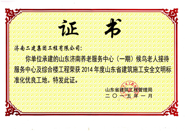 热烈庆祝我公司承建的山东济南养老服务中心(一期)候鸟老人接待服务中心及综合楼工程荣获2014年度山东省建筑施工安全文明标准化优良工地