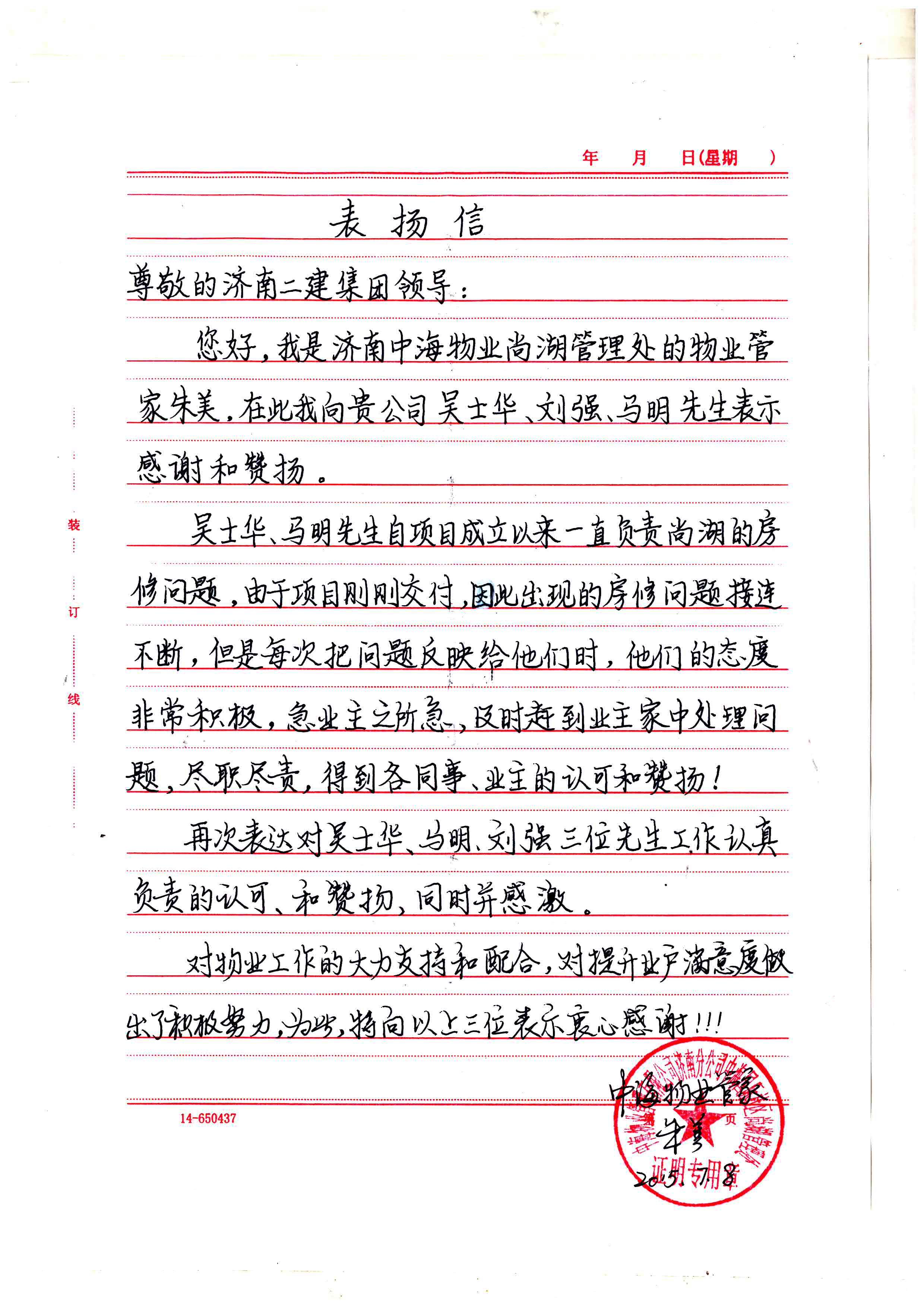 第二工程分公司所在的中海物业发来感谢信,感谢在吴士华、刘强、马明态度积极,工作认真、尽职尽责,希望全体员工以他们为榜样,做好客户回访工作,积极解决客户提出的问题。