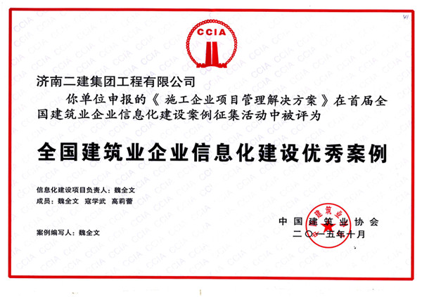 济南二建集团工程有限公司 申报的《施工企业项目管理解决方案》在首届全国建筑业企业信息化建设案例征集活动中被评为