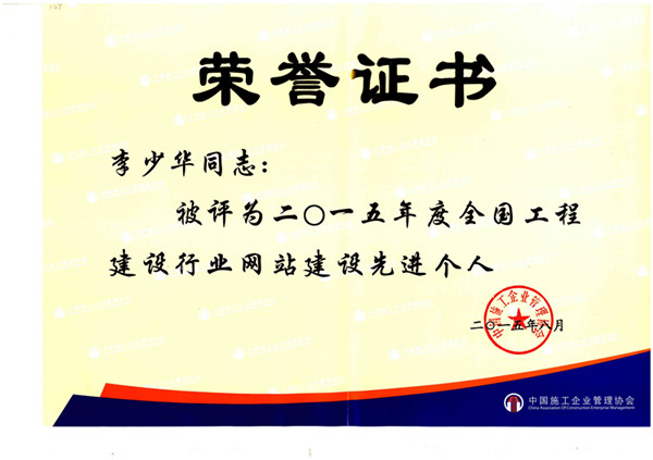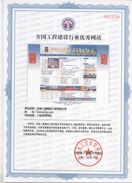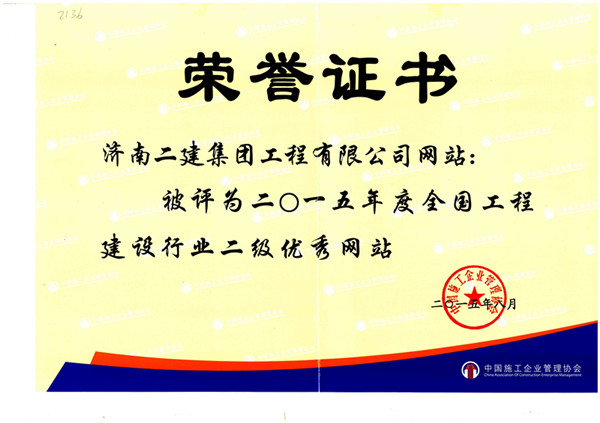 济南二建集团工程有限公司网站被评为2015年度全国工程建设行业二级优秀网站,李少华同志被评为2015年度全国工程建设行业网站建设先进个人。