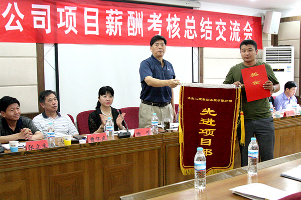 商卫执行总经理宣读了5月份薪酬考核表彰决定,对5月份薪酬考核取得第一名的第七工程分公司北大槐树项目部进行表彰,颁发奖金1万元和流动红旗一面;