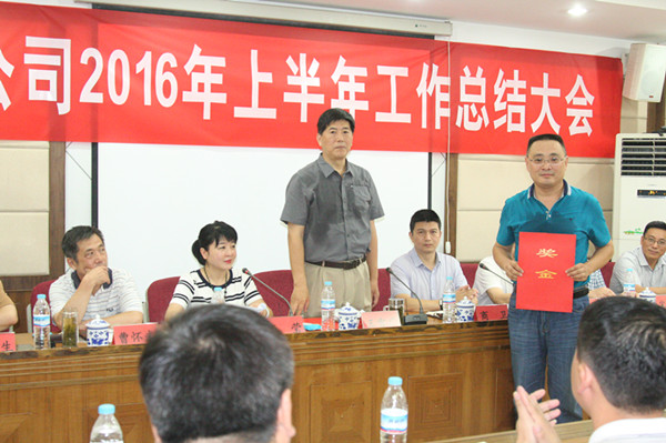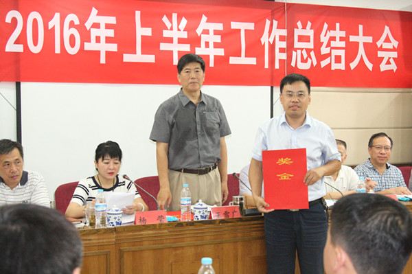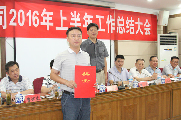 王董事长、杨副董事长、商执总、寇副总经理分别为获得2016年上半年项目薪酬考核第一名的七分公司北大槐树项目、第二名的三分公司恒大金碧新城项目、第三名的九分公司西客站安置三区项目、7月份薪酬考核第一名的六分公司恒大绿洲项目颁发锦旗、奖金