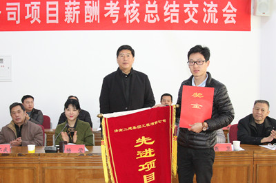 商卫执行总经理宣读了10月份薪酬考核表彰决定,对10月份薪酬考核取得第一名的第六工程分公司恒大绿洲项目部进行表彰,各颁发奖金1万元和流动红旗一面;