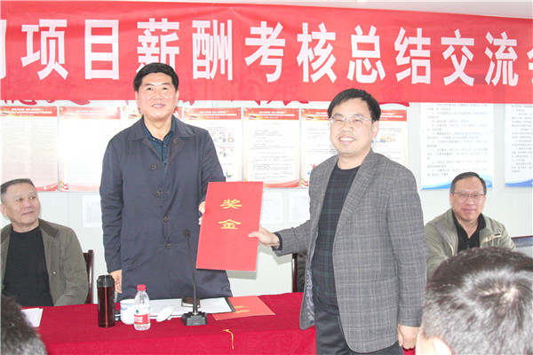 寇学武副总经理宣读3月份薪酬考核表彰决定,对3月份薪酬考核取得第一名的第三工程分公司恒大翡翠华庭项目部进行表彰,颁发奖金1万元,流动红旗一面;
