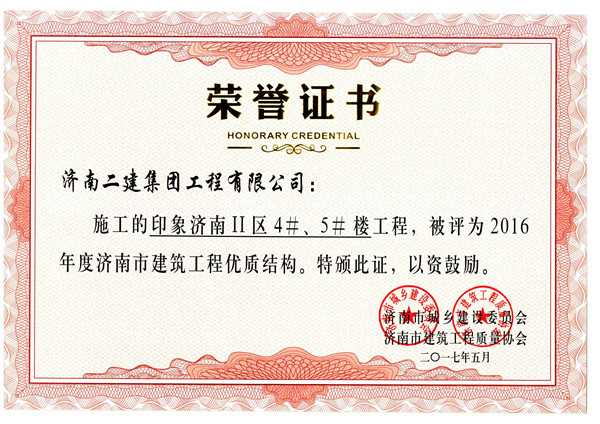 集团施工的印象济南II区4、5#被评为2016年度济南市建筑工程优质结构.
