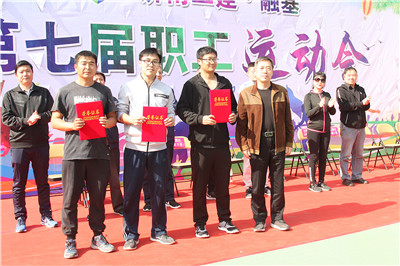 董建胜副总经理为获得男子组铅球比赛第一、二、三名的三分公司代表队全盛荣、五分公司代表队沈冰鑫、融基公司代表队薛国鹏颁发荣誉证书